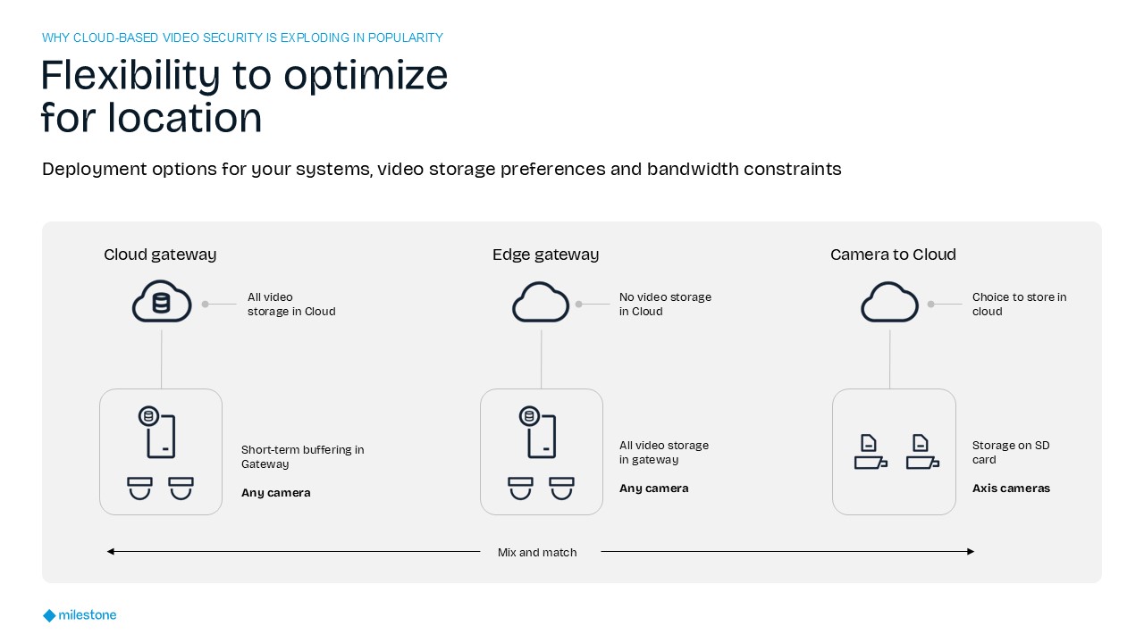 • VSaaS offers a subscription-based model which reduces capital expenditures and provides operational flexibility. This model supports various deployment options, including cloud gateway, edge gateway and camera-to-cloud architectures.