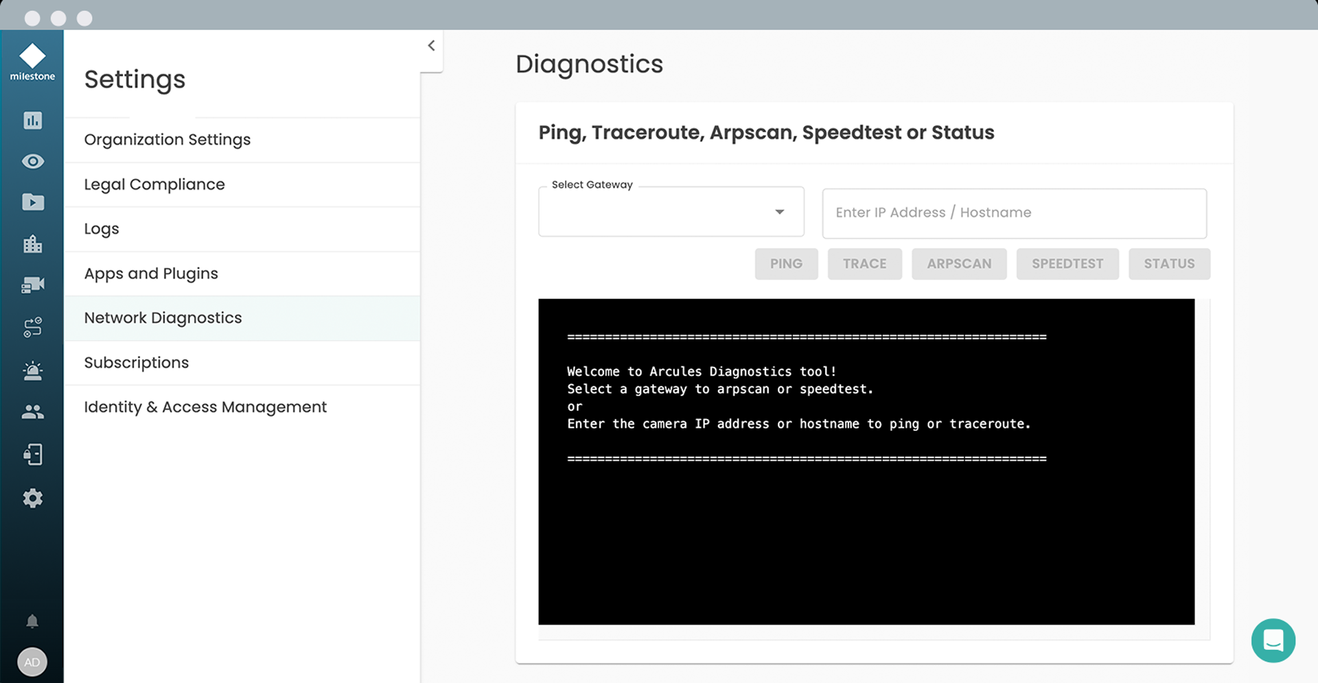 Network diagnostics in the Arcules interface help enhance cybersecurity by enabling ping, traceroute, ARP scan, speed tests and status checks to detect unauthorized devices, identify network anomalies, and ensure secure, reliable connectivity.