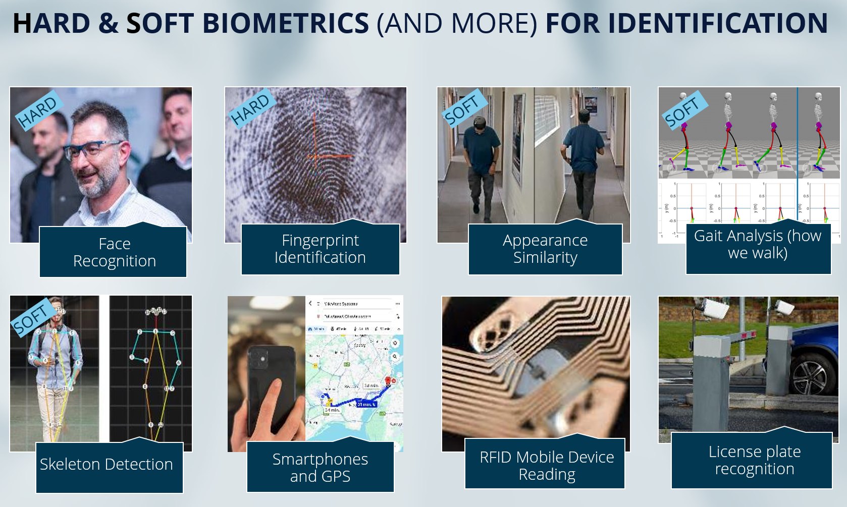 Face recognition is one of many identification approaches, ranging from hard biometrics to softer, context-based and non-biometric methods that can be applied depending on the use case.