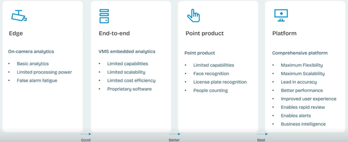 If you have a small site and very few cameras, edge analytics might be enough. Once you have dozens or hundreds of cameras with different brands and models, then you start needing a more robust system of analysis. It’s most likely going to be a centralized or server-based solution. But how do you know if a VMS is sufficient or if you also need BriefCam?