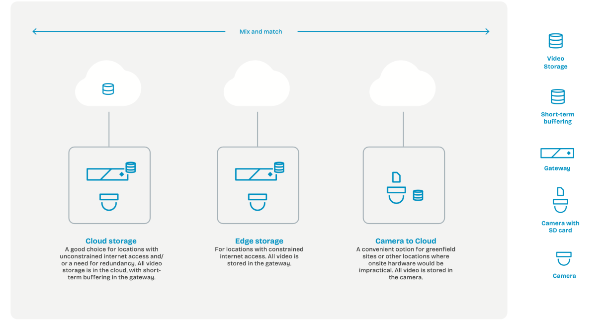 | Edge Storage | Ideal for locations with constrained internet access | Limited internet access | Gateway (local storage) | Gateway + Camera |