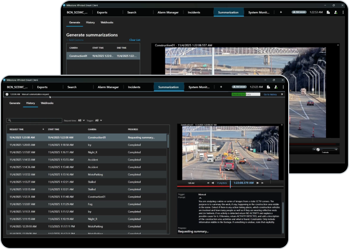 Generate plain-language summaries of recorded footage, powered by the Milestone VLM. Search summaries to pinpoint critical moments based on context, not timestamps. Reduce alarm fatigue with ready-to-go summaries of triggered alarms to swiftly assess relevance and urgency. And turn video into incident documentation using your templates — so operators spend less time on admin.