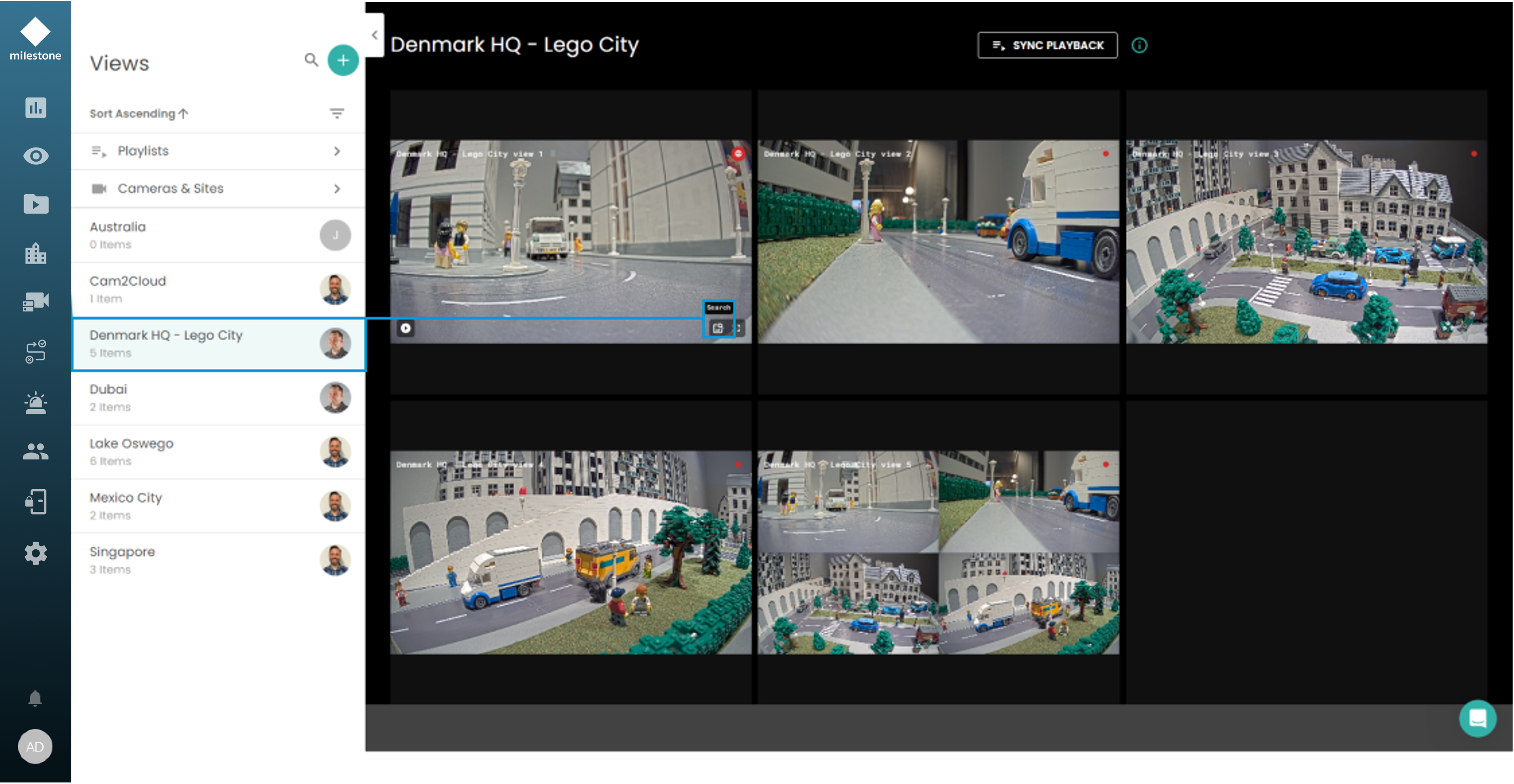 Let’s look at an example of forensic search. First, from either the Views or Devices page, you’d click on a specific view. The next step is to click on the “Search” icon in the bottom right corner of the camera window: