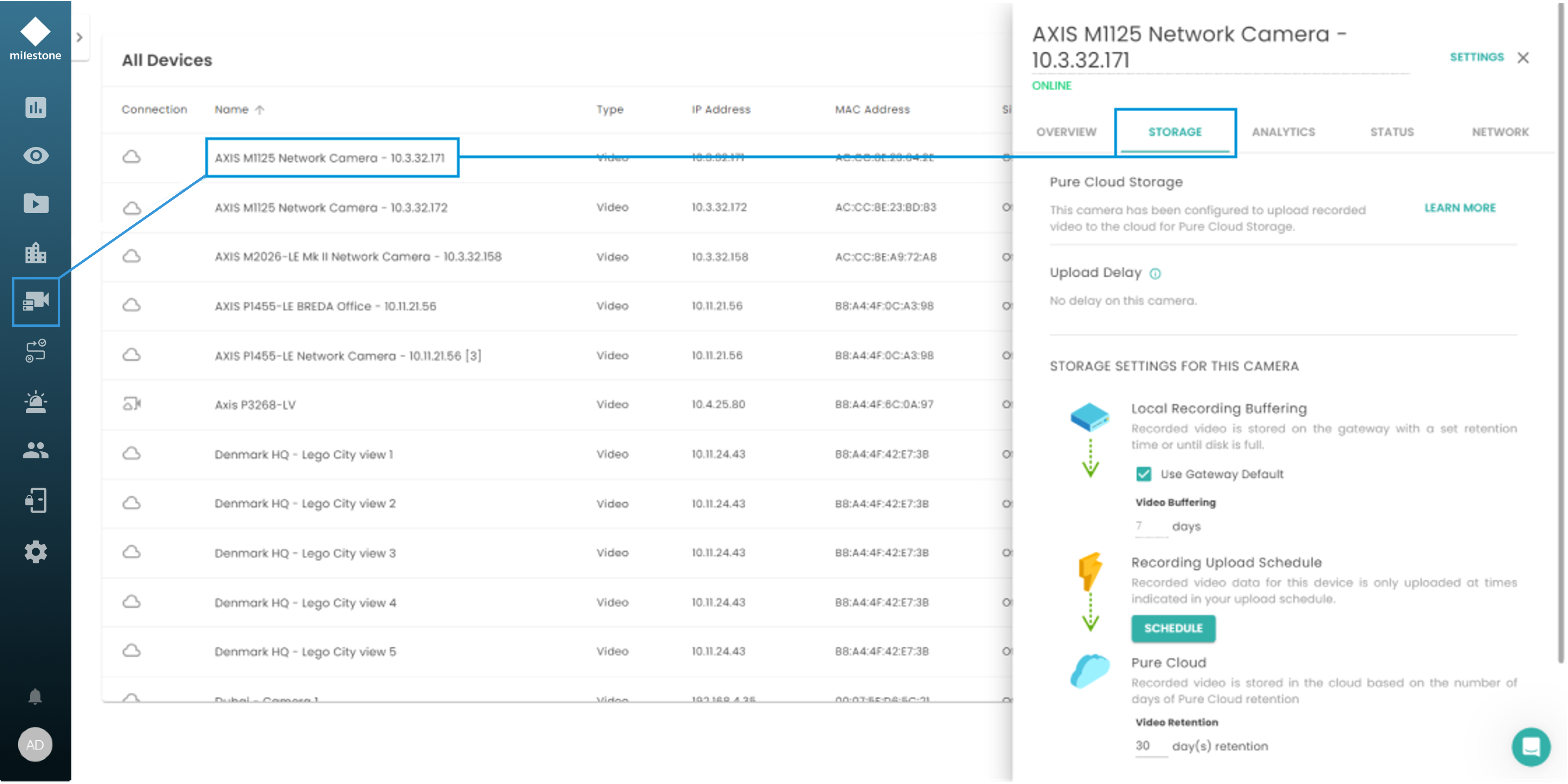 If you have a combination of deployment needs, you might want to use gateways for established sites and Camera to Cloud for new locations. This gives you an opportunity to use your existing cameras by connecting to a gateway at established sites. If you are installing new cameras, using a cloud-connected camera will help you save hardware cost since the gateway isn’t necessary. All of the cameras and video feeds are accessed together in Arcules, regardless of deployment type. When you select the “Devices” tab in the Arcules, you’ll see all gateway-connected cameras have a cloud icon next to them. Camera to Cloud connections appear with a camera+cloud icon.
