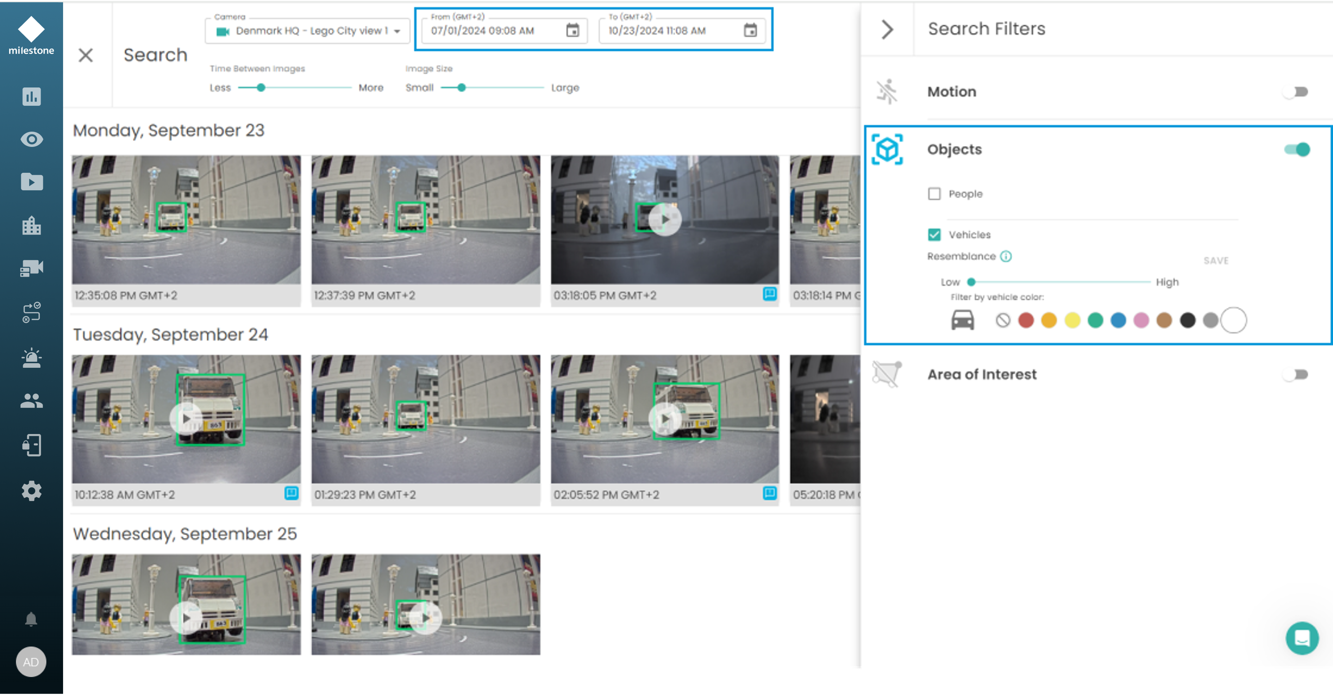 This brings you to the forensic search view, where you select the date range and filter for objects, people and/or people. In this example, we’ve searched for footage containing a white vehicle, within a given date range. The result is a list of videos all containing the specified object, which the interface highlights in green: