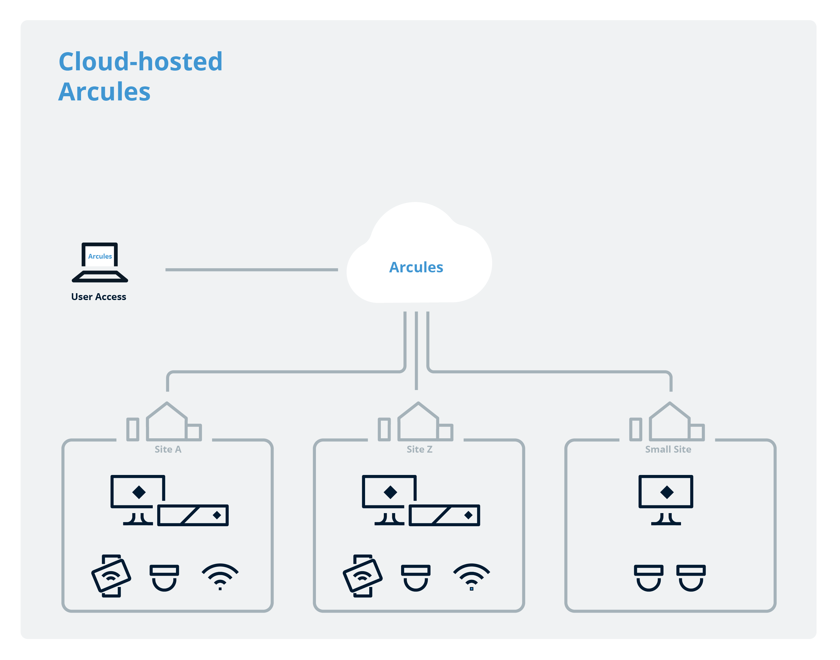 Let’s look at two options for Arcules deployment: gateway-based deployment and Camera to Cloud. In the illustration below, sites A and Z are both using gateways, and the Small Site is using Camera to Cloud.
